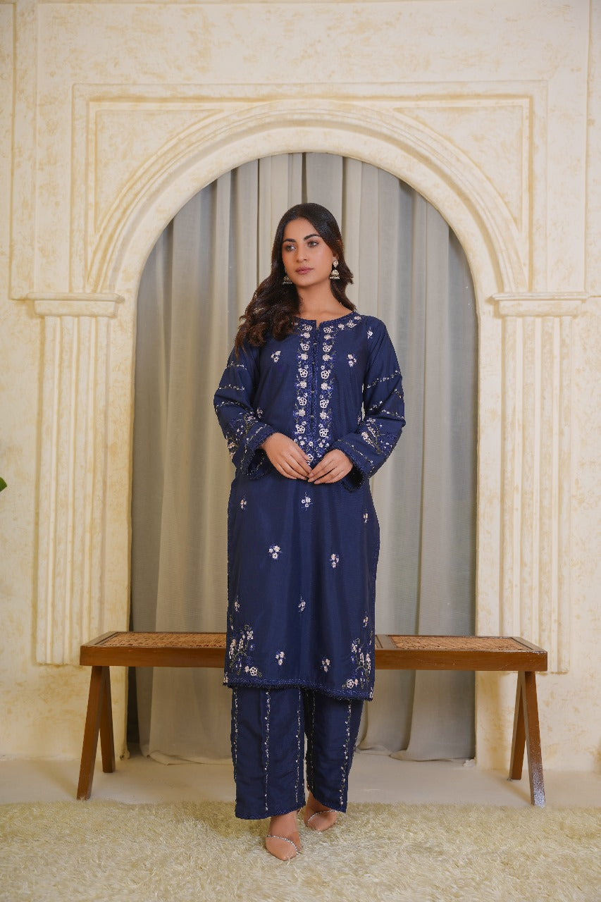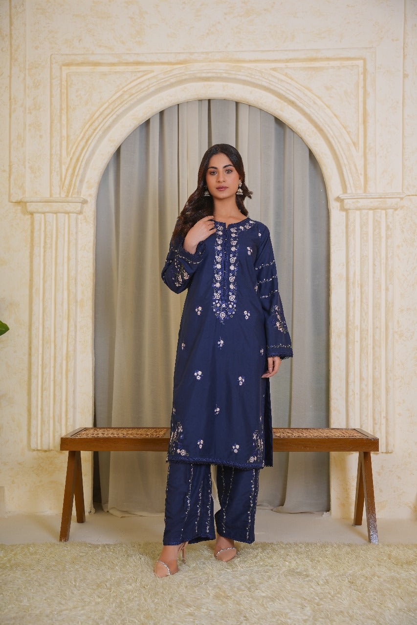 Make a bold fashion statement with this elegant ready-to-wear 2pc Pima Lawn ensemble in classic Black. The long straight shirt features a gracefully composed neckline with intricate embroidery spreading vertically down the front panels in warm floral hues. Thoughtfully placed detailing lends a perfect balance of traditional charm and modern refinement.
