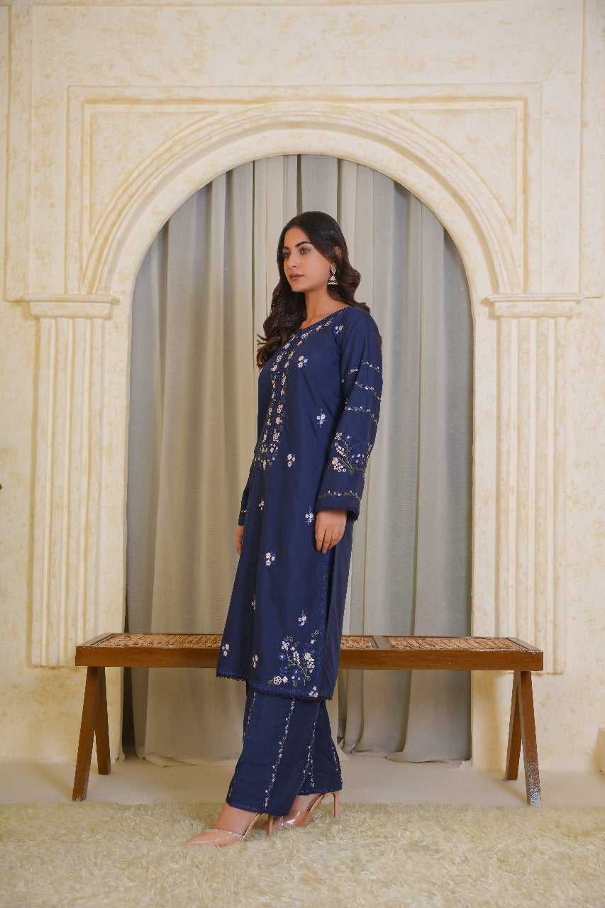 The shirt’s sleeves and hem are adorned with delicate lace and embroidered borders, adding a graceful finish to the overall design. Paired with matching Pima Lawn Trousers, featuring coordinated embroidery at the hem, this ensemble radiates festive sophistication while offering comfort and versatility for formal and semi-formal occasions.