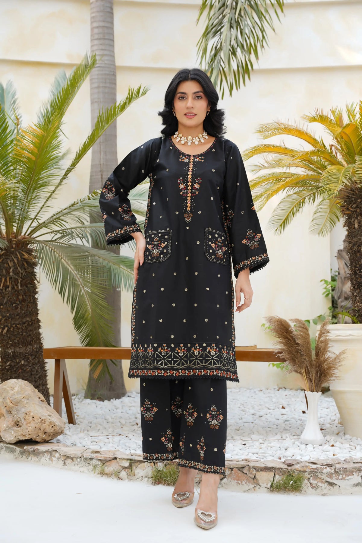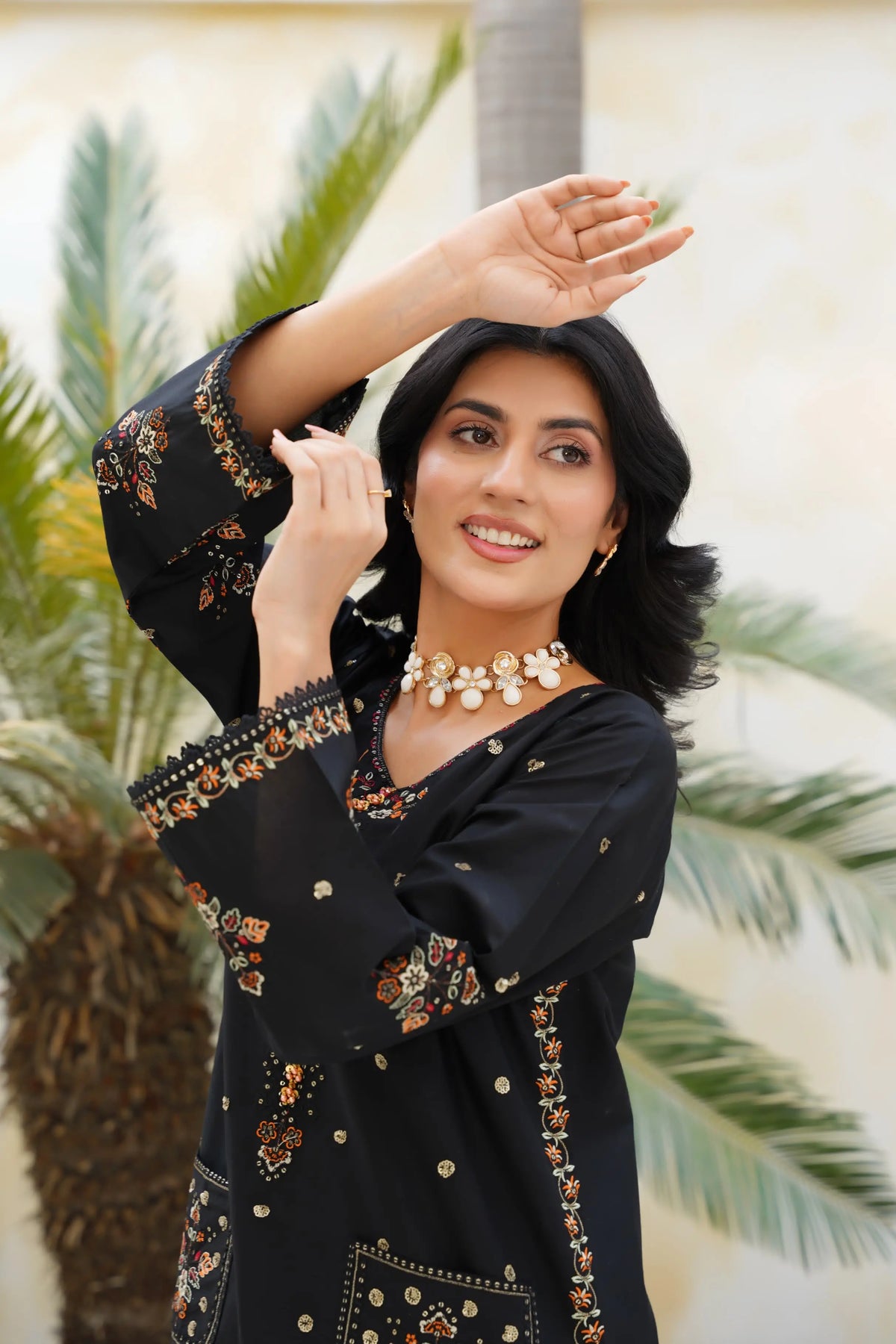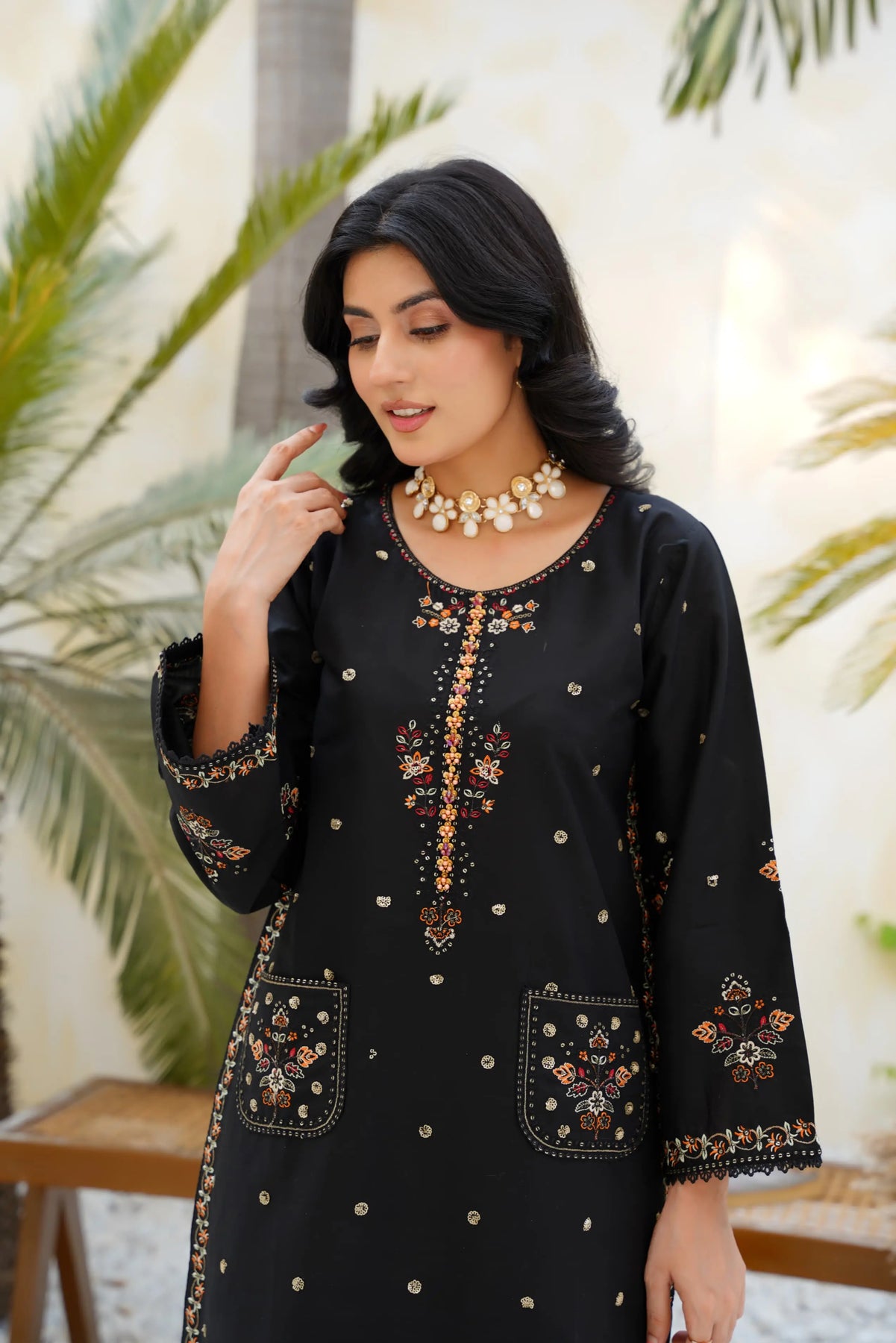 Introducing this elegant article crafted from premium quality Pima Lawn in classic black, designed for the Summer Collection 2025. This long straight shirt features a heavily embroidered hem that brings depth and richness to the silhouette. The neckline is adorned with composed embroidery, while the front boasts an elaborate embroidery spread, creating a striking and refined appearance.