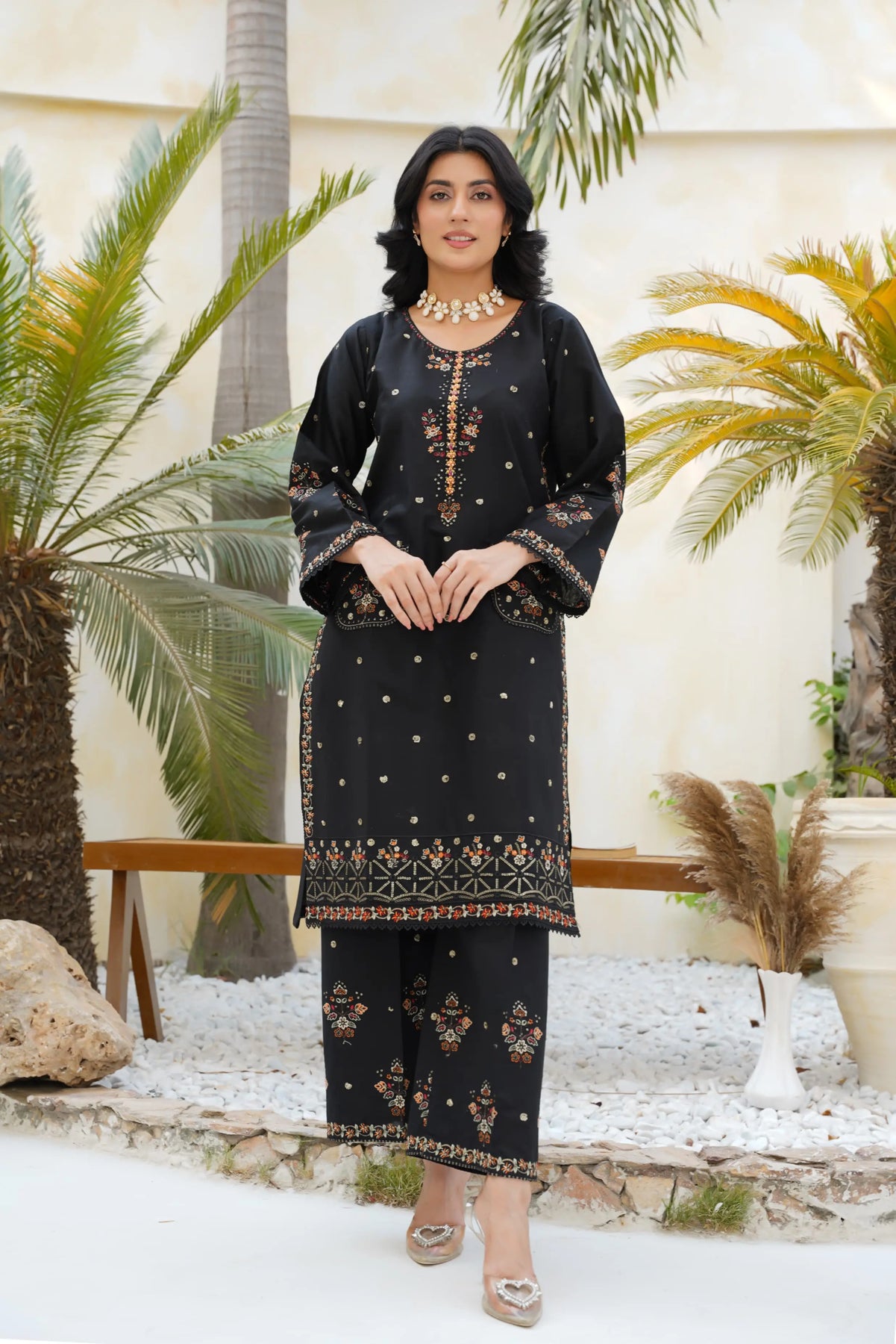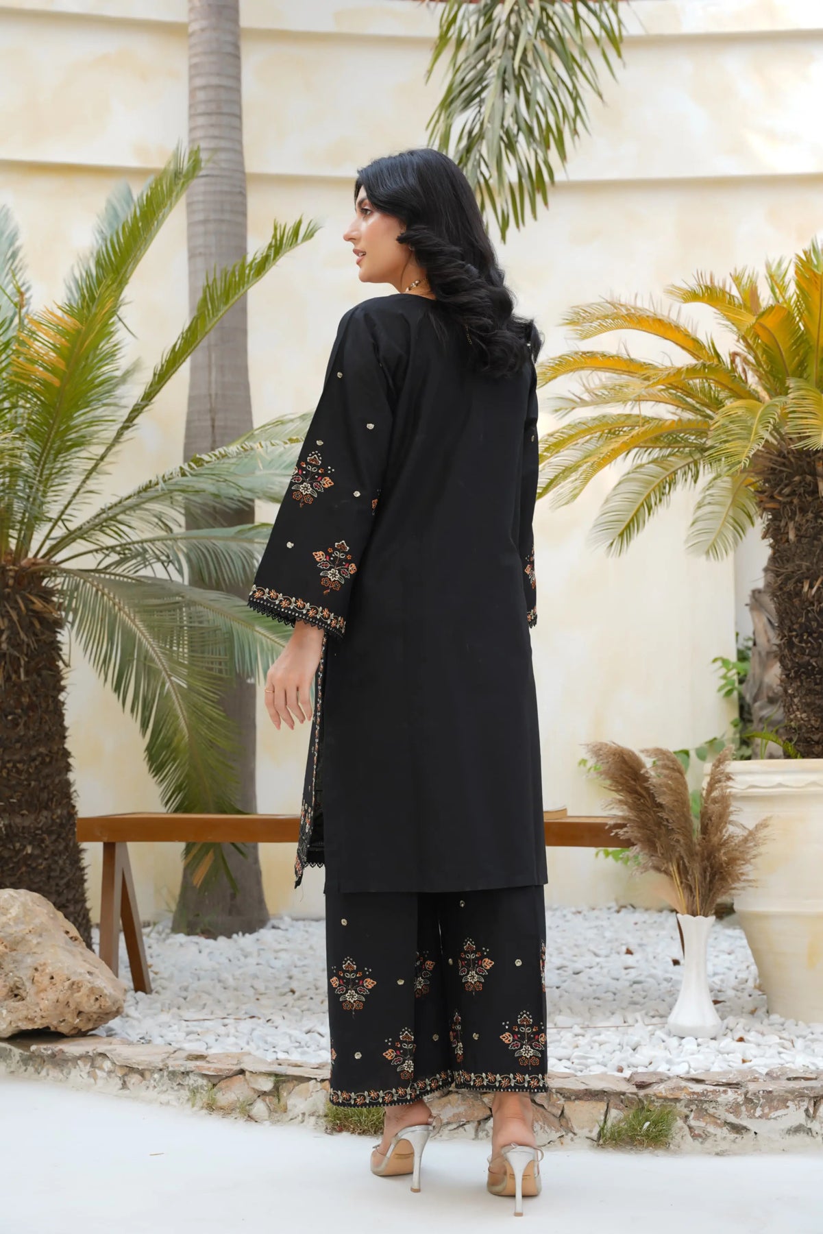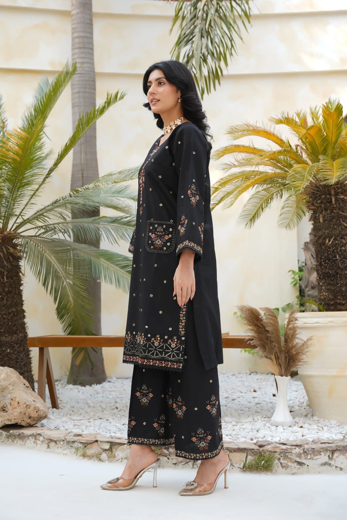 Introducing this elegant article crafted from premium quality Pima Lawn in classic black, designed for the Summer Collection 2025. This long straight shirt features a heavily embroidered hem that brings depth and richness to the silhouette. The neckline is adorned with composed embroidery, while the front boasts an elaborate embroidery spread, creating a striking and refined appearance.