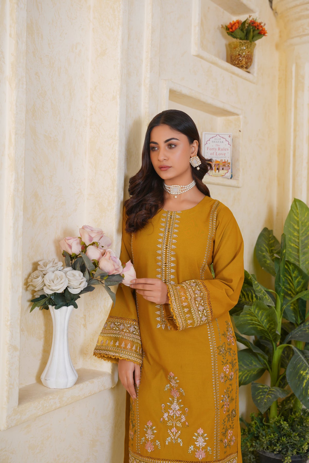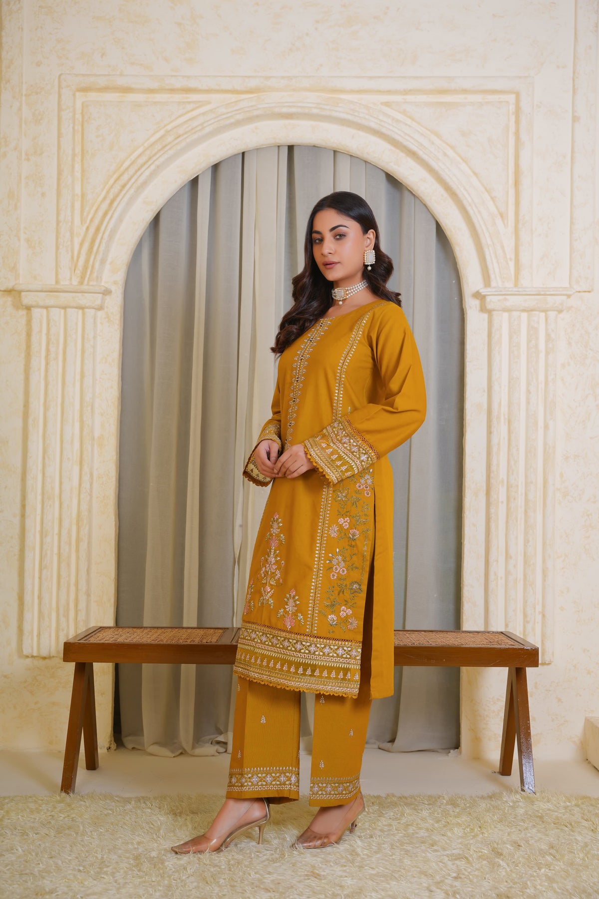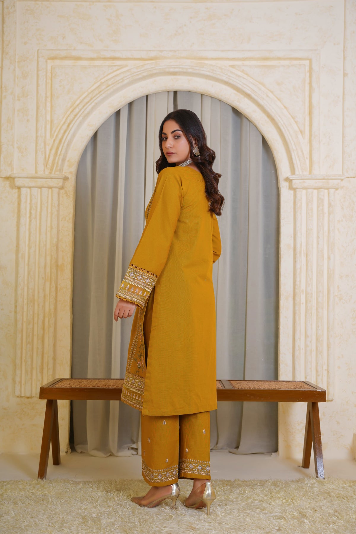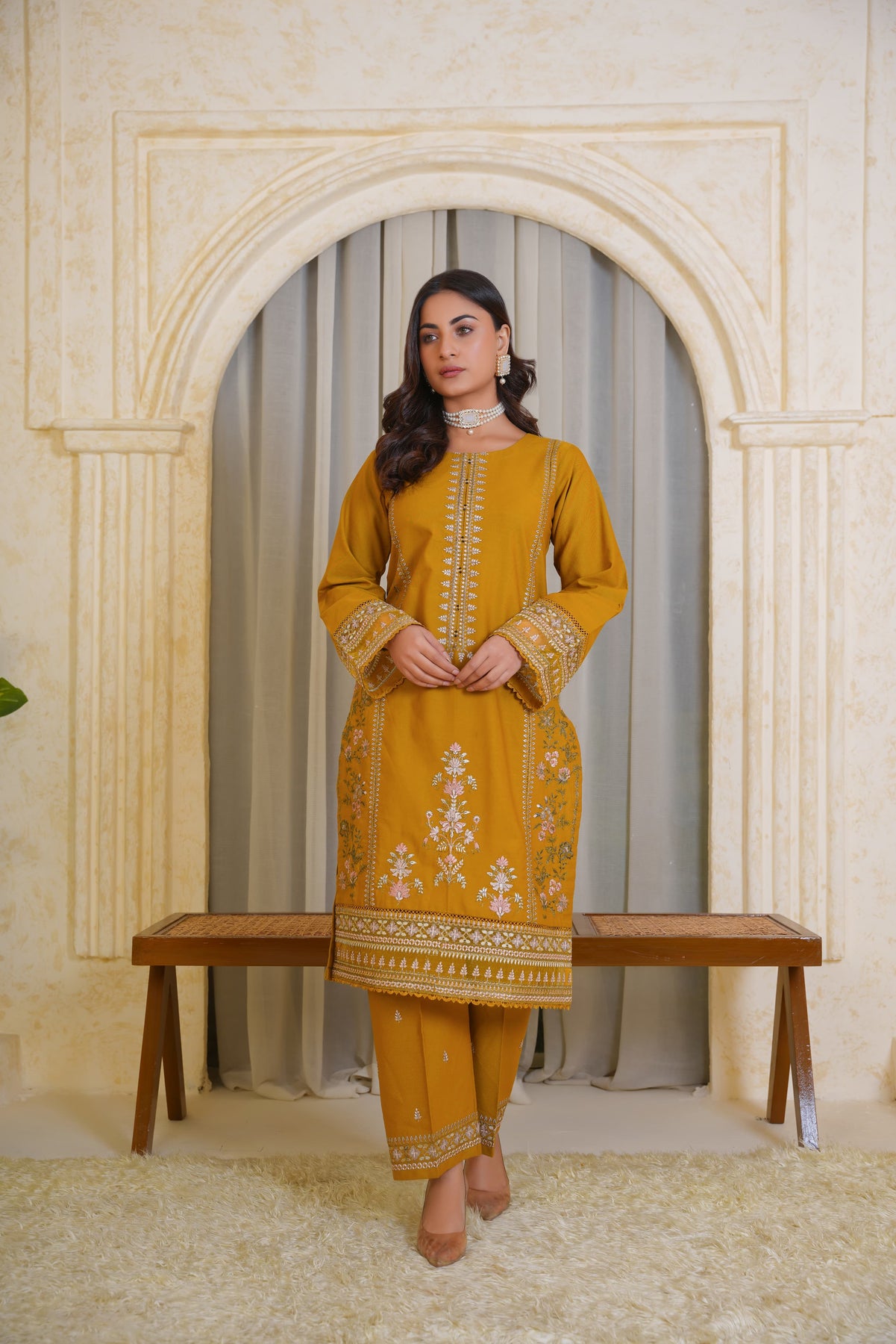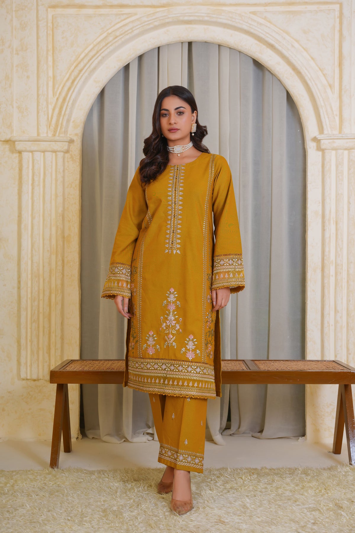 A chic and timeless addition to your summer wardrobe, this premium quality Mustard Pima Lawn 2-Piece Dress is designed to elevate your festive and semi-formal looks. The straight-cut embroidered shirt features a crew neckline with a delicately stitched slit, finished with self-piping for a clean look. Intricate embroidery in soft contrast tones adorns the center panel and lower front, complemented by a beautifully detailed border at the hem and sleeves.